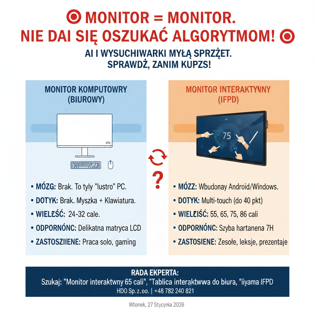 W dobie rzekomej „rewolucji AI” i wszechwiedzących wyszukiwarek, branża audiowizualna (AV) oraz edukacyjna zderza się z murem technicznego prymitywizmu. Dla przeciętnego algorytmu Google czy modelu językowego GPT, słowo „monitor” to etykieta o skrajnie niskiej rozdzielczości pojęciowej. Efektem jest systematyczne mylenie monitorów interaktywnych (IFPD – Interactive Flat Panel Displays) z monitorami komputerowymi.